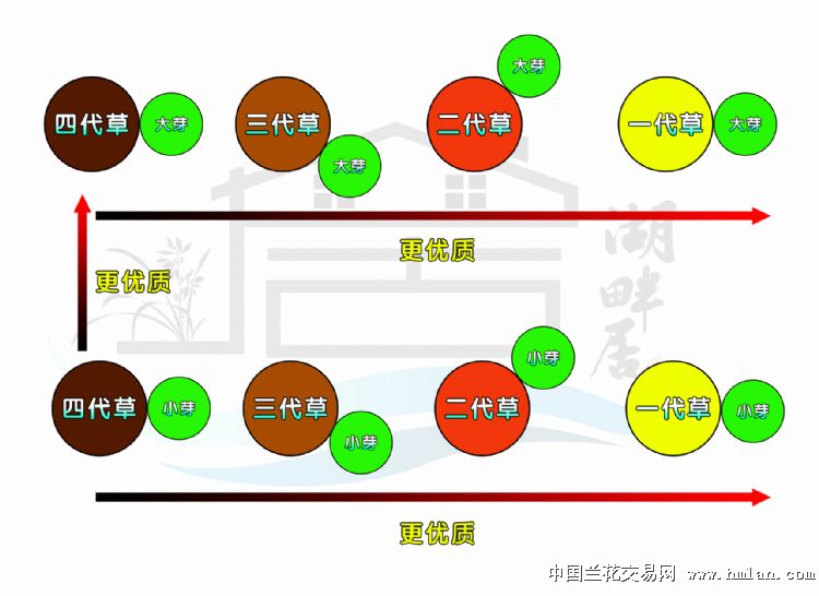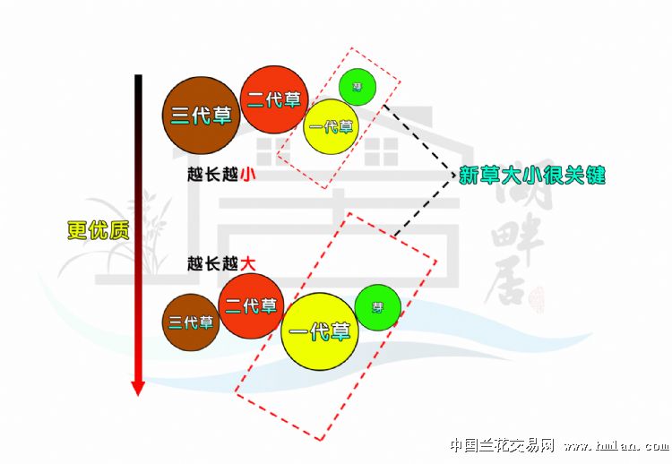 一般惯例称:1代2代连体为子母草,1代3代连体为爷孙草,以此类推。但同样的2苗草或者带芽的草都有优有劣。一般是新草越大就越好,新草越大,分下之前营养供给越充足,后期生长也越好,发的苗也越大。请看示意及态势。