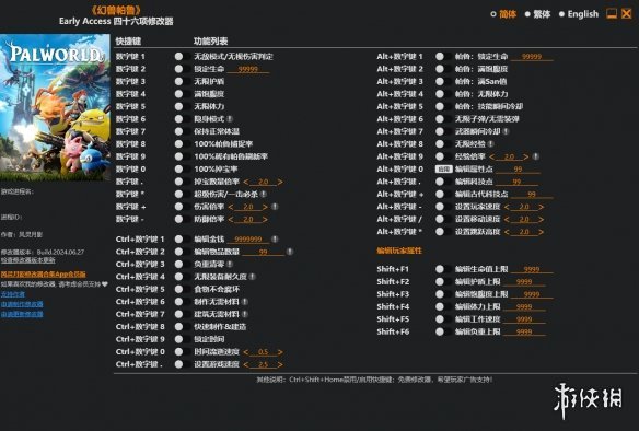《幻兽帕鲁》四十六项修改器风灵月影版,堪称游戏开挂神器。数字键可激活无敌、隐身等实用效果,还能提升捕捉和掉宝几率;Ctrl 组合键方便编辑金钱、实现无材料制作与建造;Alt 组合键可调控帕鲁状态、经验值等;Shift+F 系列键则用于精确调整玩家属性上限。无论想轻松战斗、快速获取资源,还是自由掌控游戏节奏,它都能轻松满足。
