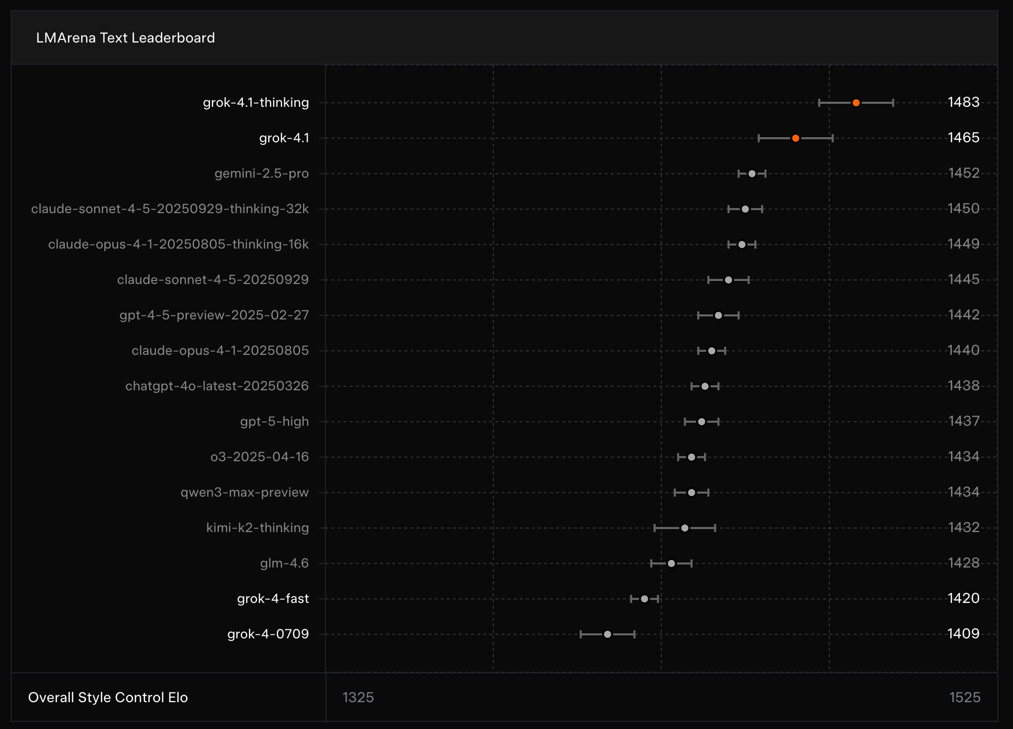 在“通用能力”上,Grok 4.1 在 LMArena Text Arena 等排行榜中取得了领先地位。比如其 thinking 模式(代码名 quasarflux)Elo 值约 1483。