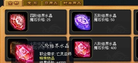 要提升结界那么就需要物品来提升,那么需要的物品就是魔石商店里的亡灵结界水晶,他们分为:一级.二级.三级.四级.五级.六级.七级.八级,分别的价格为:2魔石.5魔石.12魔石.25魔石.50魔石.100魔石.200魔石.400魔石。分别可以加的姐姐经验是:20点.50点.120点.250点.500点.1000点.2000点.4000点。