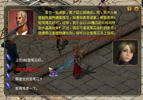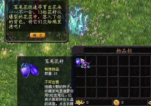 幸运的是,鸠里德的夫人正醉心于鸾尾花这种园艺植物,鸠里德希望你能帮他找到5粒鸾尾花籽,事成之后,就来和你谈谈转世水晶的买卖。不过,现在并非鸾尾花结籽的季节,即使是找到鸾尾花丛,却又如何取到花籽呢?正当你认为这是收藏家的刁难时,他却向你介绍了一种神秘的药剂。