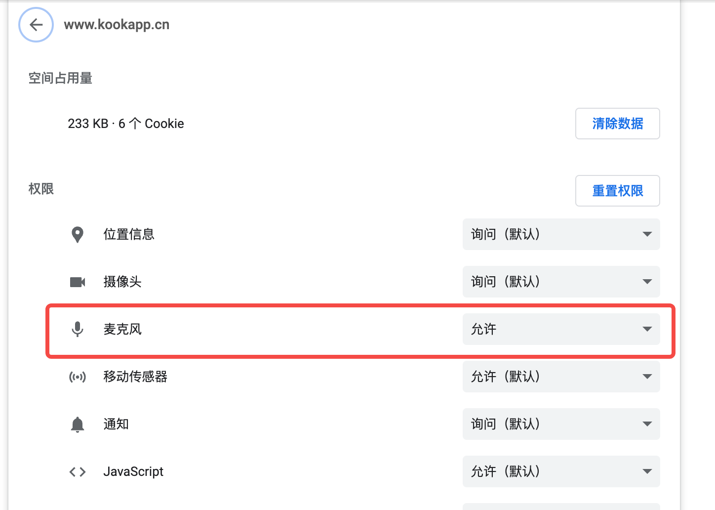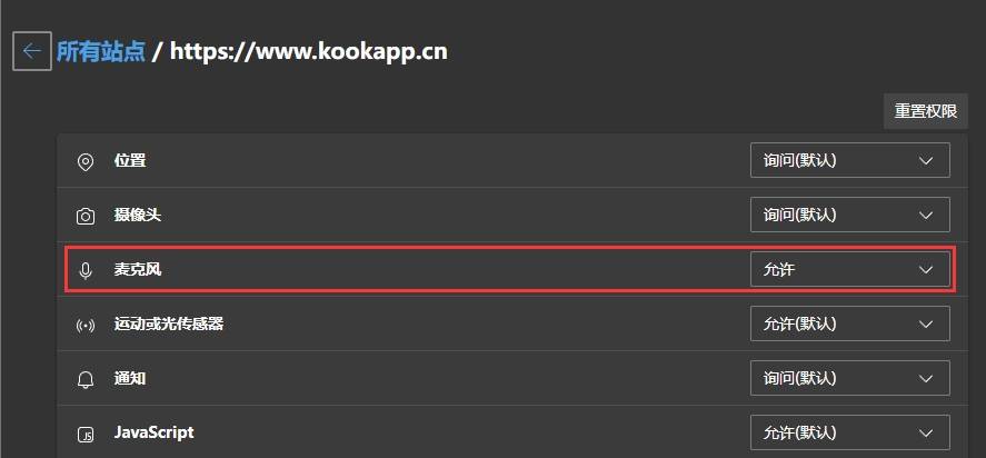3. 在新开的页面中,修改“麦克风”项目为“允许”。至此,麦克风授权完成。