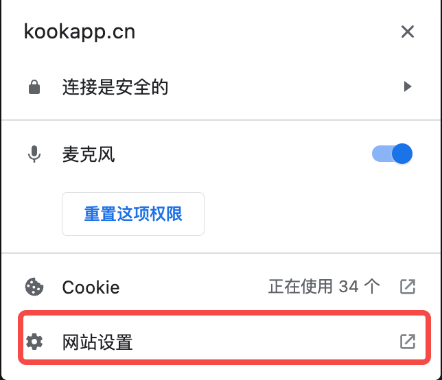 Chrome(谷歌浏览器)1. 点击地址栏左侧小锁,修改“麦克风”项为“打开”状态(滑块变蓝就表示打开了)。至此,麦克风授权完成。