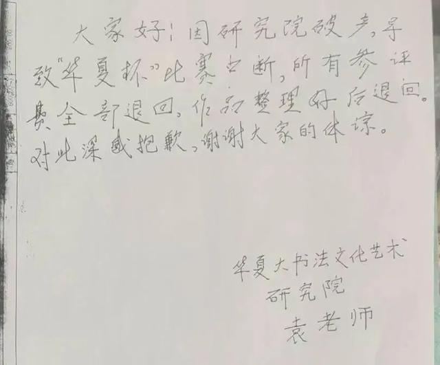 对获奖名单造假的原因,该工作人员一开始声称不太清楚,后又给记者发送了一张手写道歉信,落款为该研究院负责人袁老师。道歉信中提到,因研究院破产,导致“华夏杯”比赛中断,所有参评费全部退还,作品整理好后退回。