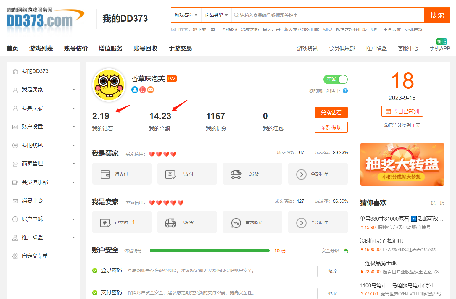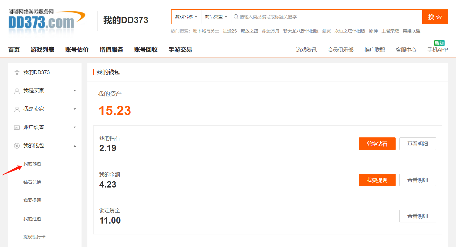 2、或者可以点击“我的钱包”,魔域奇珍晶石进入我的钱包页面,可点击我的钻石、我的余额、锁定资金后方“查看明细”按钮。