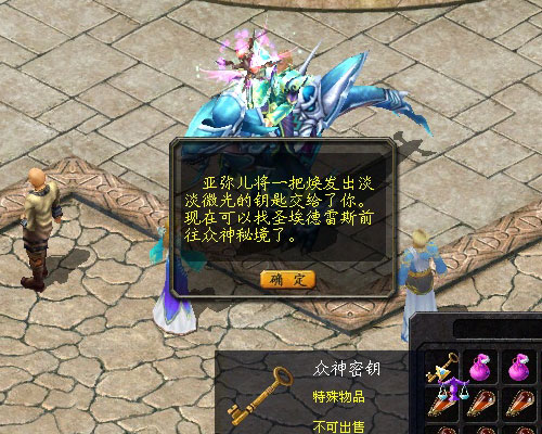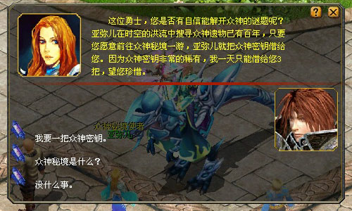 一天可以领取3把众神密钥,但是一次只能领取一把。先向亚弥儿领取一把钥匙,然后找到圣埃德雷姆,就可以进入众神秘境了。
