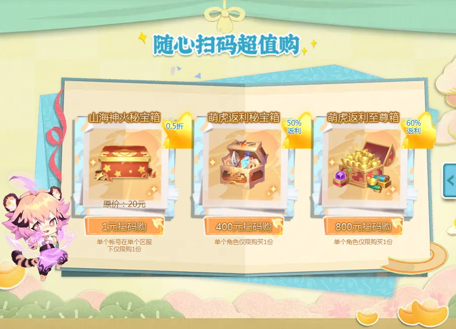1元山海神火秘宝箱持续放送,本次新增两款萌虎系列返利箱,高达60%返利特惠不容错过!