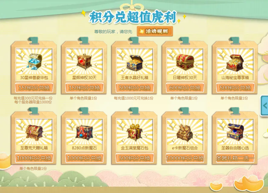 积分兑换部分的奖励依旧超级给力!王者水晶立刻冲宝库壕取3级珍兽灵药,至尊荒天赠礼箱即刻满足您的套装需求,还有海量京东e卡备战一波京东618足矣!