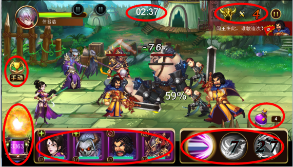 闯关过程中,最爽的就是消耗怒气释放技能了,每个伙伴都会慢慢回复一定的怒气,杀敌可回复大量怒气,伙伴损血也会回复一定量的怒气,伙伴头像框绿、蓝、紫、金分别代表可以释放1、2、3、4次技能,点击龙珠可以一键释放所有技能,主角的技能cd时间到了就可以释放,主角血量不足时可以点击右下角血瓶补点血哦,您可以点击自动战斗来托管游戏轻轻松松就能过关,关注游戏上方剩余敌军量和结束时间,尽快杀敌才能避免失败哦!