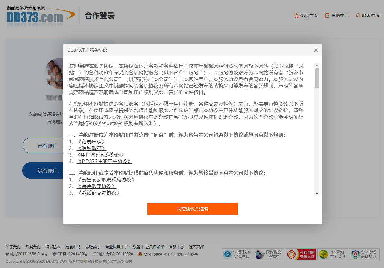 20、点击“同意协议并继续”按钮,进入注册DD373账户并绑定第三方登录页面。