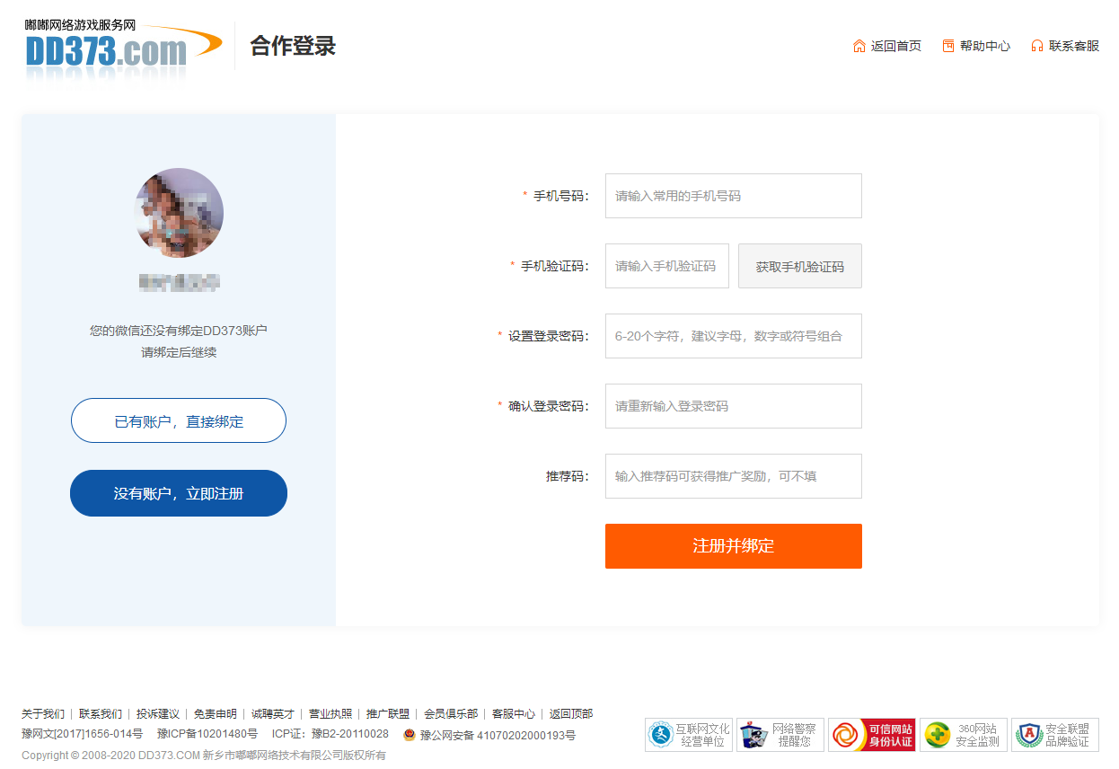 17、如您没有DD373账户,点击“没有账户,立即注册”按钮,进入DD373账户注册绑定页面。
