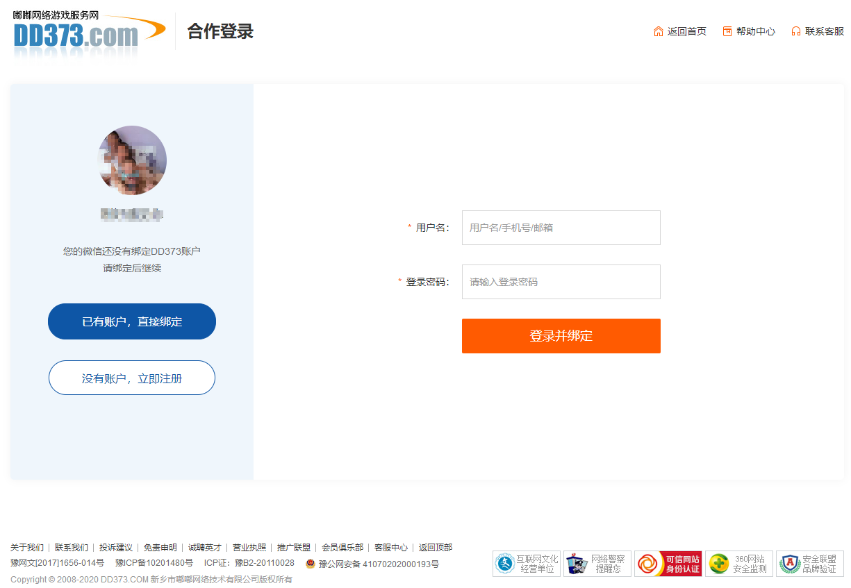 14、如您的第三方账号没有绑定DD373账户,将进入合作登录页面。
