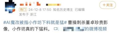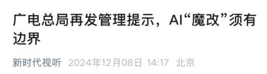 《管理提示》指出,近期,AI“魔改”视频以假乱真、“魔改”经典现象频发。如《甄嬛传》变身“枪战片”,《红楼梦》改成“武打戏”,孙悟空骑着摩托车扬长而去等。《管理提示》认为,这些视频为博流量,毫无边界亵渎经典IP,冲击传统文化认知,与原著精神内核相悖,且涉嫌构成侵权行为。