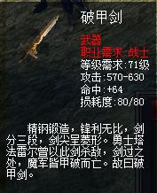 名称:破甲剑;职业需求:战士;类别:武器;等级需求:71级;精钢锻造,魔域单机程序锋利无比,剑分三段剑尖呈菱形。勇士塔法雷尔曾以此剑杀敌,剑过之处,魔军皆破甲而亡,故曰破甲剑。这把剑也是颇具来历呀!勇士塔法雷尔杀敌所用之剑,曾经也是令魔兵闻风丧胆!