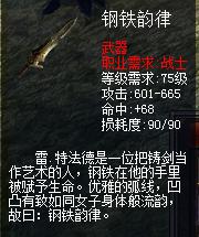 名称:钢铁韵律;职业需求:战士;类别:武器;等级需求:75级;雷·特法德是一位把铸剑当作艺术的人,钢铁在他的手里被赋予生命。优雅的弧线,凹凸有致如同女子的身体般流韵,故曰:钢铁韵律。一位把铸剑当作艺术的大师,钢铁在其手中不再是冰冷的铁块,而是像有了生命一般,不知道这把含有浓厚艺术气息的钢铁韵律,战场杀敌是是否也有这么优美。