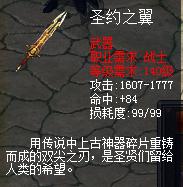 名称:圣约之翼;职业需求:战士;类型:武器;等级需求:140;用传说中的上古神器碎片重铸成的双尖之刃,是圣贤们留给人类的希望。作为目前战士职业的顶级装备,圣约之翼无论从外观还是从由来上,都对得起这个称号,而且把兵器的效果也是十分赞!虽然小记没有140级以上的战士号,但是小记看别人带这个兵器的模样,小记也是一样兴奋!