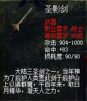 名称:圣影剑;职业需求:战士;类型:武器;等级需求:96级;大陆三大圣剑之一,当年神为了庇护人类置此剑与庇护山上以镇群魔,千百年来,取日月精华,凝天人之力。大名鼎鼎的大陆三圣剑之一,与绯红圣言同位大陆三圣剑,其实看到这儿,小记也有一个疑问,大陆三圣剑的最后一把圣剑遗落在何方呢?在先后的兵器谱上,小记是无法寻找到想要的答案了。