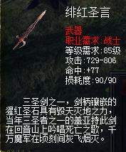 名称:绯红圣言;职业需求;战士;类型:武器;等级需求:85级;三圣剑之一,剑柄镶嵌的猩红圣石具有毁天灭地之力,当年三圣者之一的盖亚特持此剑在回音山上吟唱死亡之歌,千万魔军在顷刻间灰飞烟灭。作为亚特兰大陆的三圣剑之一,绯红圣言追随他的主人一起在亚特兰大陆留下一个个不朽的传奇!携此剑之威,在回音山上吟唱死亡之歌,千万魔军顷刻间灰飞烟灭,可见此剑威力不容小觑!