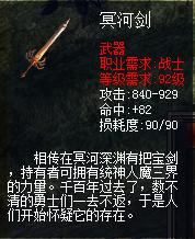 名称:冥河剑;职业需求:战士;类型:武器;等级需求:92级;相传在冥河深渊有把宝剑,持有者可拥有统神人魔三界的力量。千百年过去了,数不清的勇士们一去不返,于是人们开始怀疑它的存在。力量与权力的诱惑还是巨大的,为了力量和权力,多少人都迷失了方向,但是力量是的追求是可遇而不可求的,强制去做,往往会适得其反,所以还是顺其自然的好。