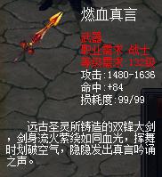 名称:燃血真言;职业需求:战士;类型:武器;等级需求:132级;远古圣灵所铸造的双锋大剑,剑身流火萦绕如同血光,挥舞时划破空气,隐隐发出真言吟诵之声。作为一个辉煌时代的升级版,外观并不是那么完美,但是威力缺不容小觑,毕竟是远古圣灵之做,威力略见一斑。
