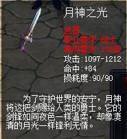 名称:月神之光;职业需求:战士;类型:武器;等级需求:108级;为了守护世界的安宁,月神将这把剑赐给了人类的勇士。它的剑锋如同夜色一样温柔,却像凄清的月光一样锋利无情。神赐之物,锋利非凡!而且这个剑的外形小记也是喜爱不已,曾亲自打造一把自己带了一年有余。