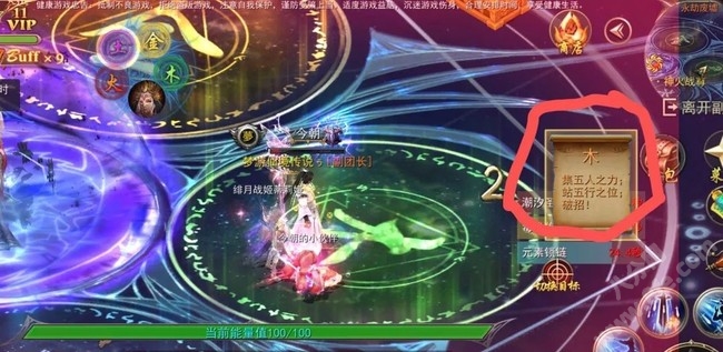 尽可能减少圈外的时间,同时能量满后会进入五行站位,每个人都为不同属性,在右边背包旁边会出现所要站的元素字,根据元素字每个人站好,5个人全部站对则成功。