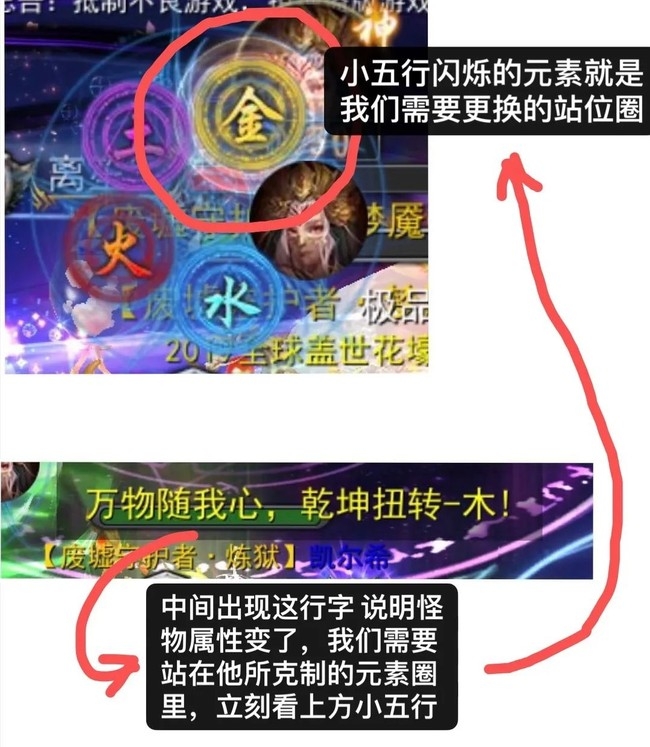 此为非右边怪物技能,在图左上方有个小五行图,每次都会闪烁我们需要站的五行圈,每次变位图中间也会出现一行字提醒换元素圈站。