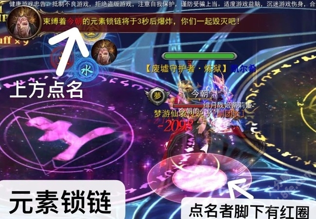 在炼狱级里的元素锁链有一个经常出现失误的地方,那就是当元素锁链技能正好遇到五行变位,点名者出圈刚好遇到队友们换元素圈而失误团灭。