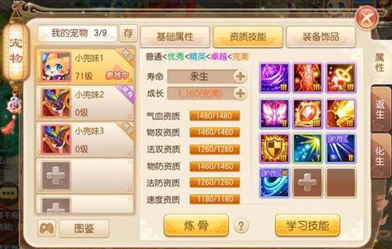 这是宠物化生前的关键步骤,首先观察一下自己变异宝宝是不是4个技能的,如果不是的话,要用便宜的技能书把它顶到4技能,先使用铭记丹铭记变异宝宝的专属技能(记得主线任务会送一个~萌猪大大还是蛮贴心的)。