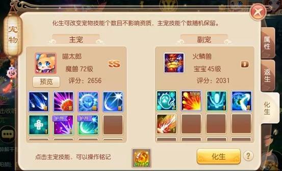 在变异宝宝出现四技能后,主宠就搞定啦,接下来就需要弄副宠(不能低于主宠的携带等级,并且副宠技能数最好大于主宠!),注意副宠的技能不能和主宠有相同的,不然返生效果会受到影响,所以需要再去商会物色4种廉价的技能书给副宠也打上。