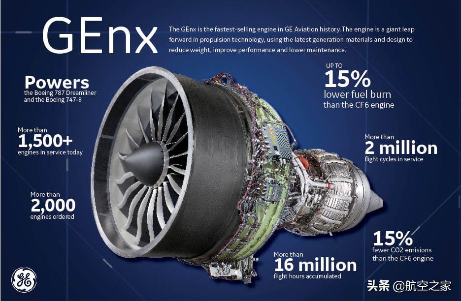 而来自美国的通用电气占据了787发动机市场的主导位置。有60%的787客机使用通用电气GEnx高涵道比涡扇发动机。它不仅用在波音787上,而且还搭载在波音另一款宽体客机上——波音747-8。
