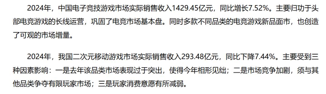 根据人民网发布的《 2024 年中国游戏产业报告 》,去年我国二次元移动游戏市场整体实际销售收入 293.48 亿元,同比下降了 7.44%,同时面临着竞争激烈、用户付费意愿降低的问题。