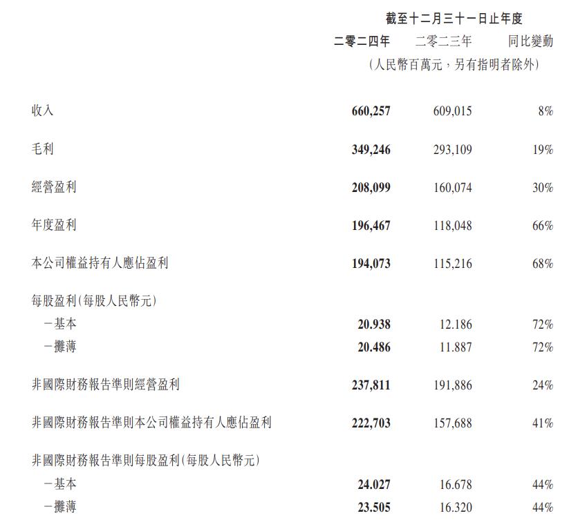 根据官方发布的财务报告,2024 腾讯年度总营收为 6602.5 亿人民币,其中净利润为 1940.73 亿( 公司权益持有人应占盈利 ),同比增长 68%。