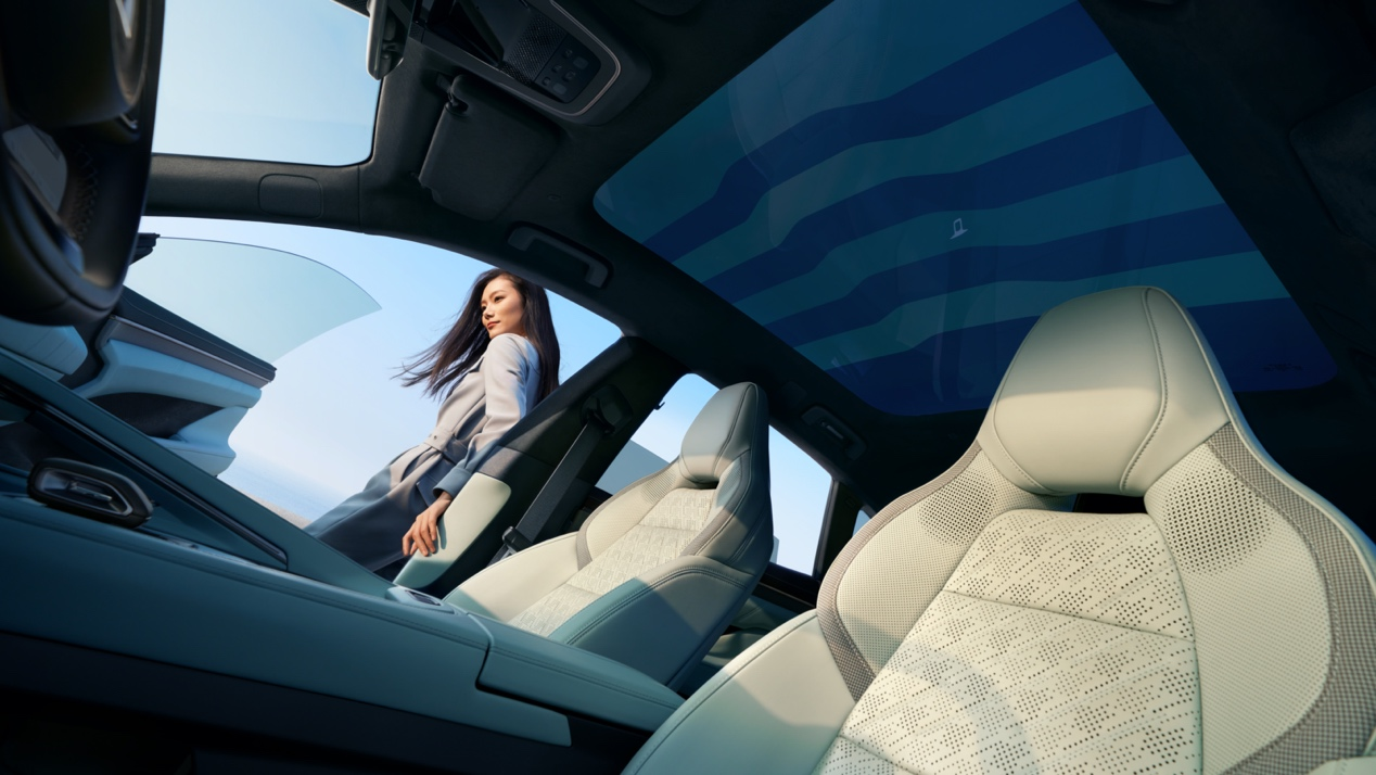 全新极氪 001 拥有行业内唯一一块采用纳米技术的 LV 分区调光天幕