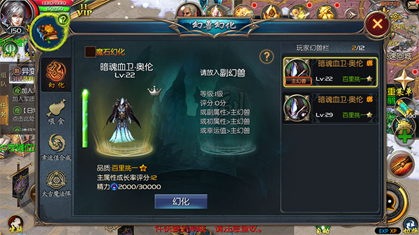 主属性幻化是用2只符合条件的幻兽进行幻化——幻化后,副幻兽消失、主幻兽的主属性成长率将会得到一定的提高。