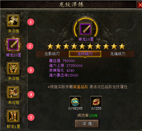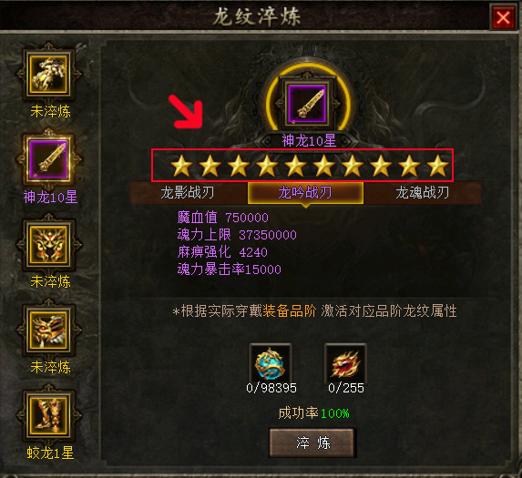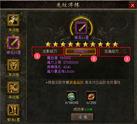 例如:蛟龙等级,需要从蛟龙1星淬炼至蛟龙10星,才能从蛟龙级升级为蟠龙级。