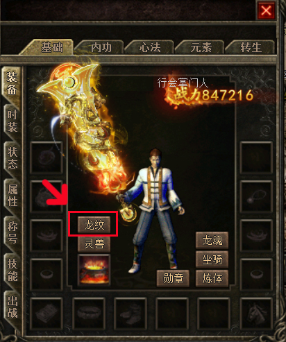 打开角色属性面板,点击新增的“龙纹”按钮,即可进入“新装备位”。