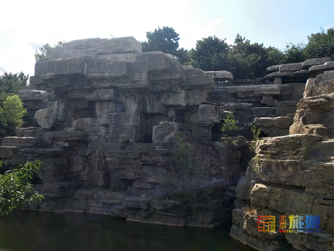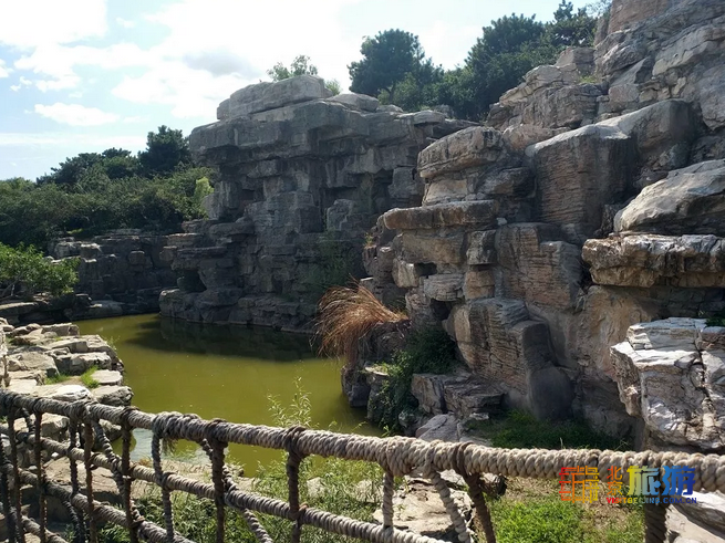 而在吊桥的边上是变化万千的假山,一泓绿水环绕之下。假山,也显得更加多姿多彩。