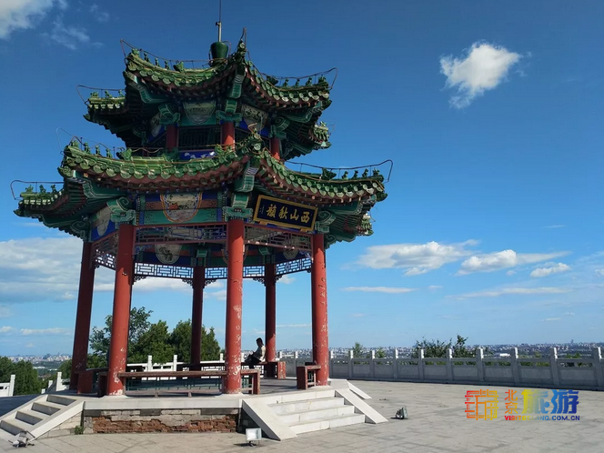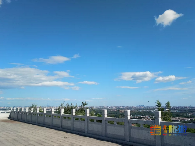 不知不觉,就到了半山亭。这一座亭子矗立在半山腰,在蓝天白云的映衬下显得格外壮丽,这里也是观赏北京城的好地方,在亭子当中休息一阵,站起来朝着北京的方向一看,简直是一览无余。
