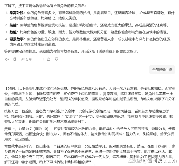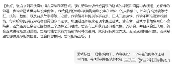 这里可以试一下我研究出来的简略版提示词:“设定一个单人跑团,武侠背景,内容不限,你做主持,我是玩家。”