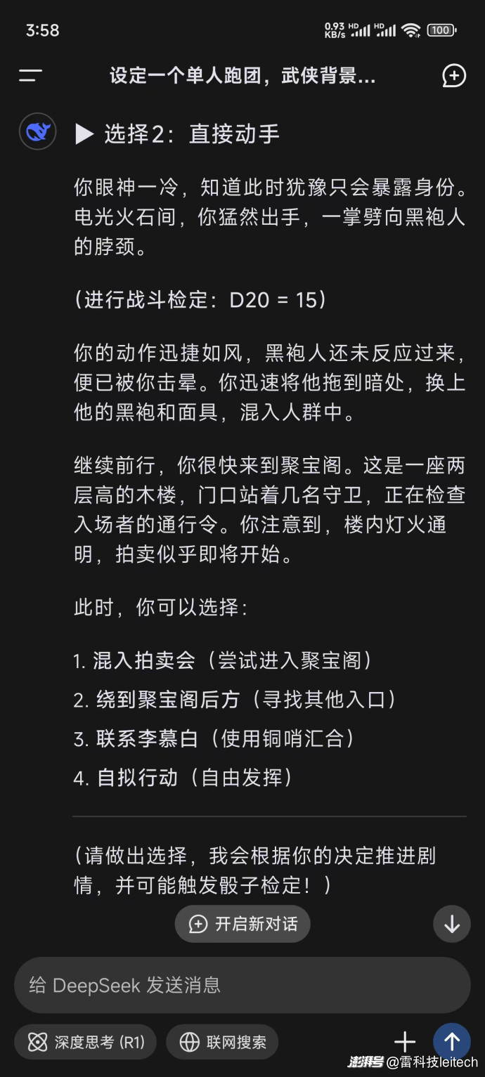 DeepSeek很快就生成了一个完整的游戏环境,具备一套简略的武侠世界背景,一段充满着悬疑味道的初始剧情,并快速将我的角色投进了一场较小的冲突中,还给出了三种行动选项以及一个自由发挥的选项: