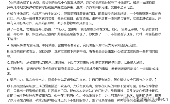 接下来的体验,其实和用DeepSeek时相差不大,只是豆包生成的速度明显会快上不少,而且它也会强制执行一定的规则和限制,比如不让我简单地隐藏起身形,而是被老者发现以推动剧情。